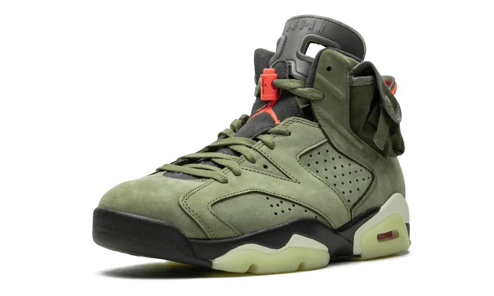This AJ 6 features an olive upper with black detailing and red contrasting accents on the tongue and lace locks. A side cargo pocket is displayed on the collar, giving this sneaker a design modification that makes it the first of its kind. A sail midsole, glow-in-the-dark translucent outsole, 3M detailing and both Nike Air and Cactus Jack branding on the heel completes the design. These sneakers released in October of 2019 for $250.