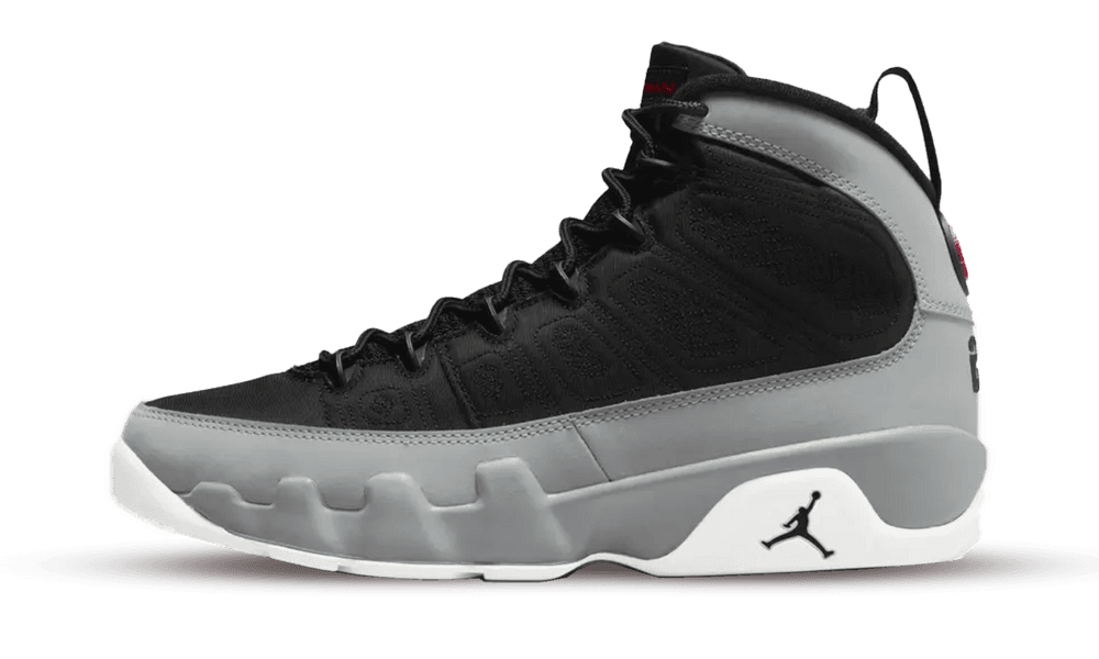 Der Air Jordan 9 Particle Grey verfügt über ein schwarzes Nylon-Obermaterial mit gesteppten Platten und hellgrauen Durabuck Kotflügel. An der Ferse bildet ein rotes Jumpman-Basketball-Emblem einen scharfen Kontrast zur neutralen Basis. Anknüpfend an das Original Air Jordan 9 rundet eine weisse Laufsohle mit geprägten Grafiken und Phrasen das Design ab.