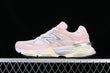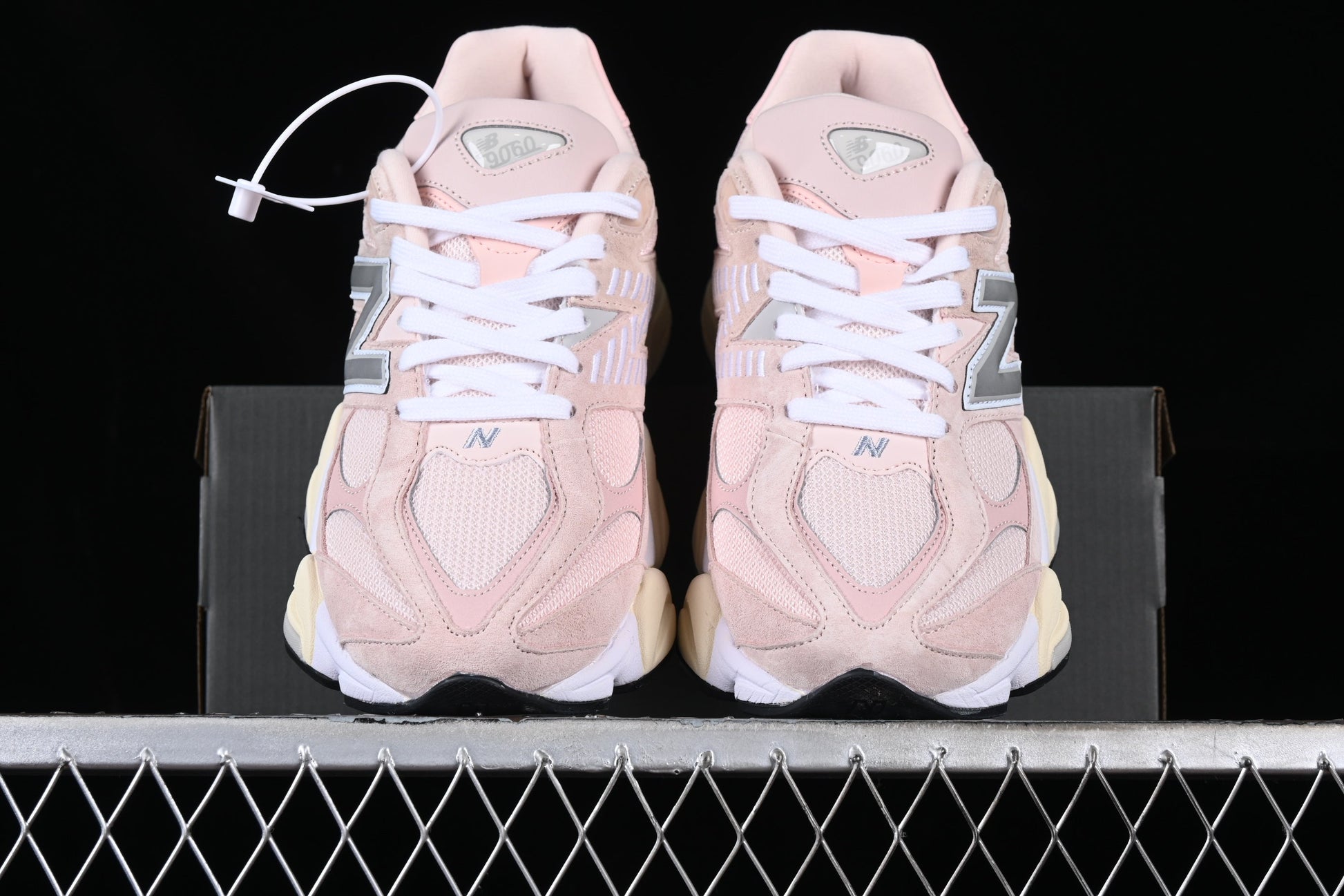 The NB9060 Pink & White captures attention at first glance. The upper features plush pigskin suede in a pastel pink tone, layered over a breathable white mesh base. These materials not only provide a luxurious feel but also ensure ventilation for all-day wear. The classic "N" logo on the sides appears in a metallic silver finish, adding a modern touch to the overall look.