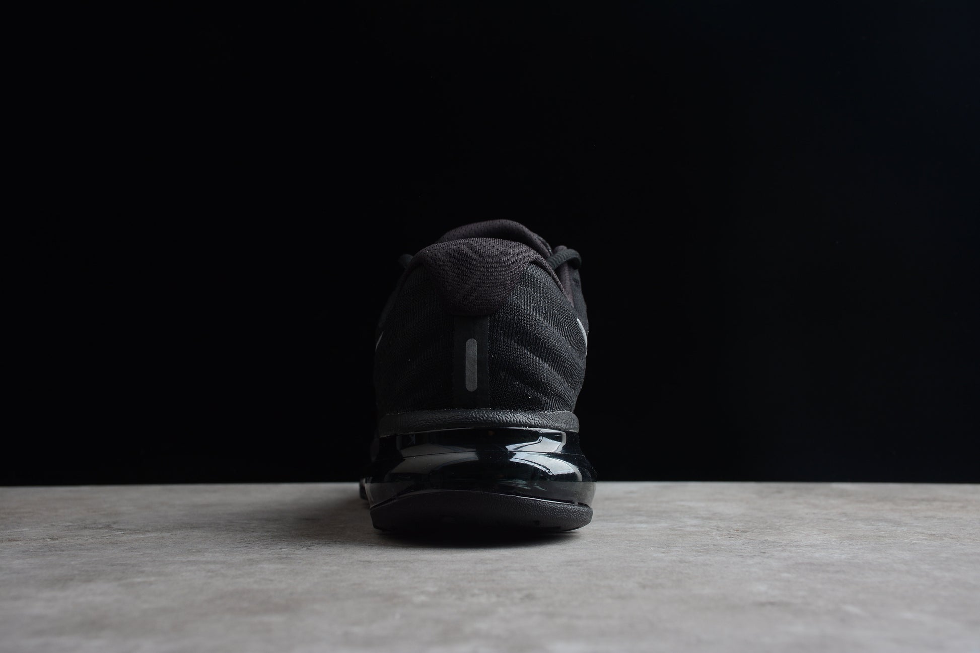 In dieser Variante ist der Sneaker fast vollständig in Schwarz gehalten – von der Mesh-Oberfläche über die Schnürsenkel bis zur Außensohle. Der silberne Swoosh auf beiden Seiten hebt sich deutlich ab und verleiht dem Schuh einen stilvollen Kontrast. Auf der Ferse sorgt ein reflektierender Streifen für bessere Sichtbarkeit im Dunkeln – ein kleines, aber praktisches Detail.