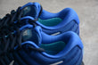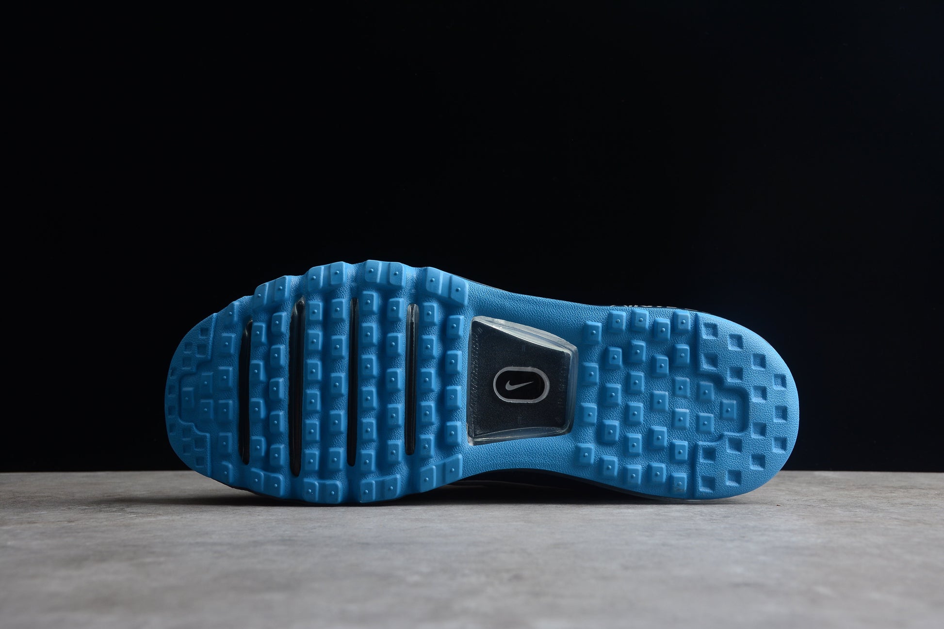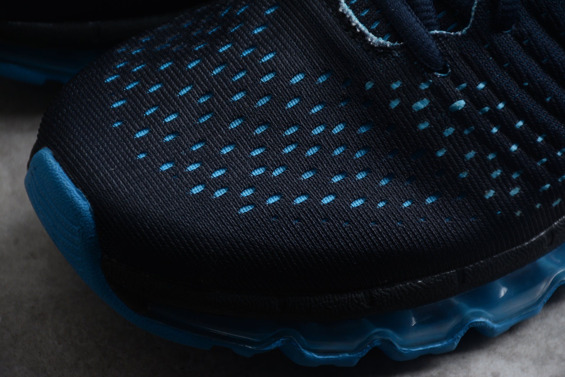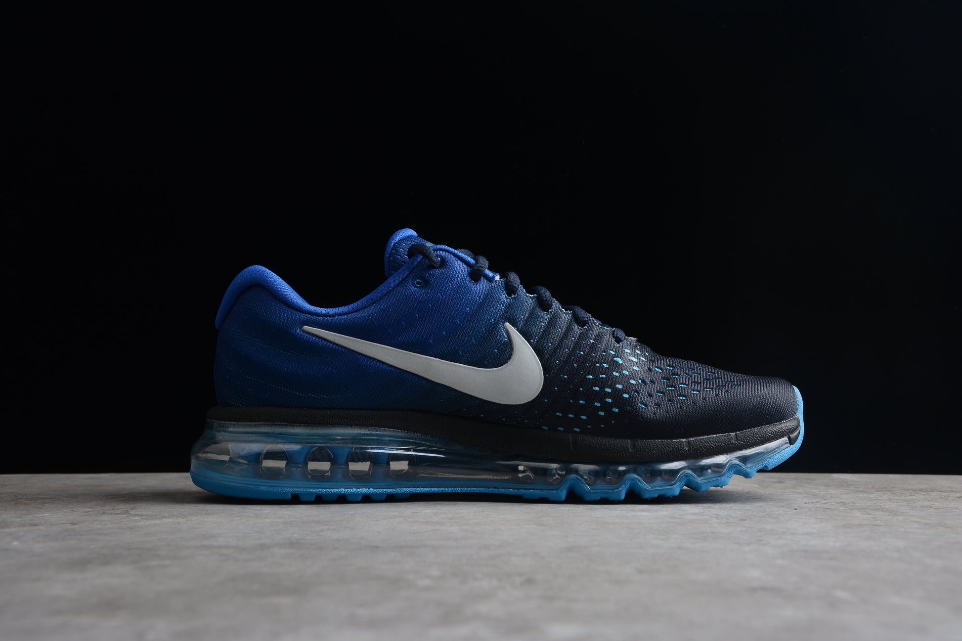 Die Schwarz-Dunkelblau-Version des Air Max 2017 überzeugt mit einem fließenden Farbverlauf: Der vordere Bereich des Schuhs ist tiefschwarz gehalten, während sich die Farbe zum Fersenbereich hin in ein sattes, königliches Dunkelblau verändert. Diese Farbgestaltung erzeugt nicht nur Tiefe, sondern auch Bewegung – der Schuh wirkt, als wäre er ständig in Aktion, selbst wenn er stillsteht.