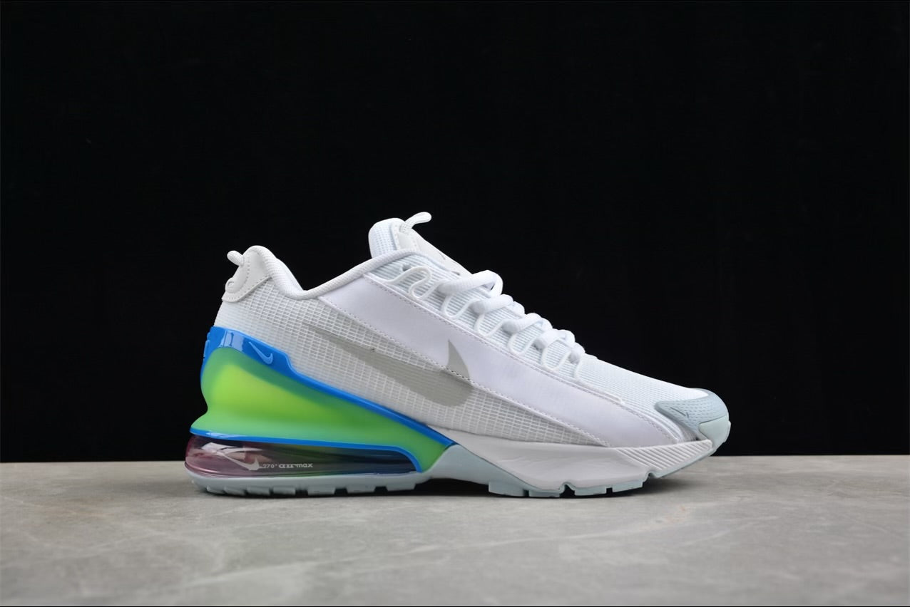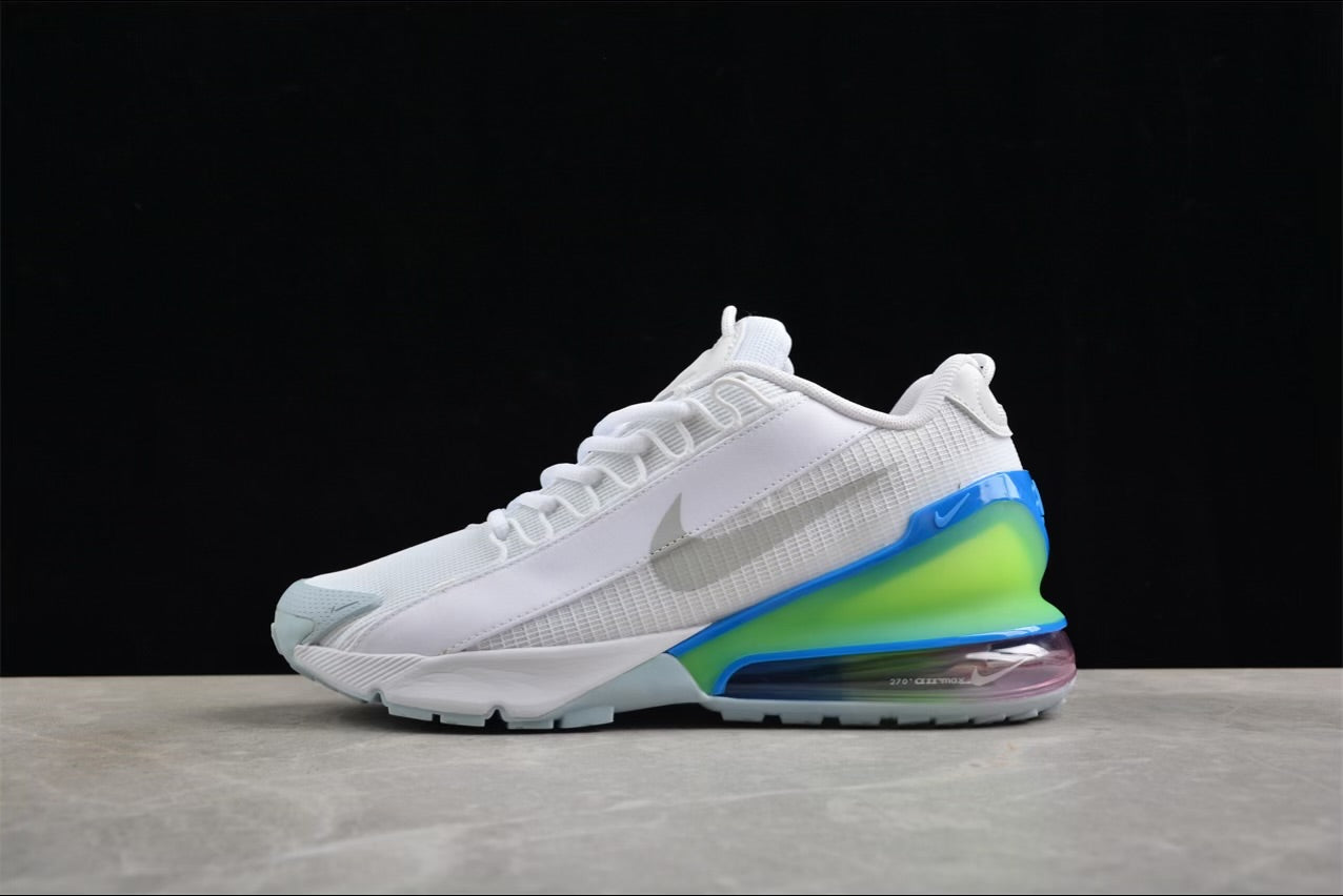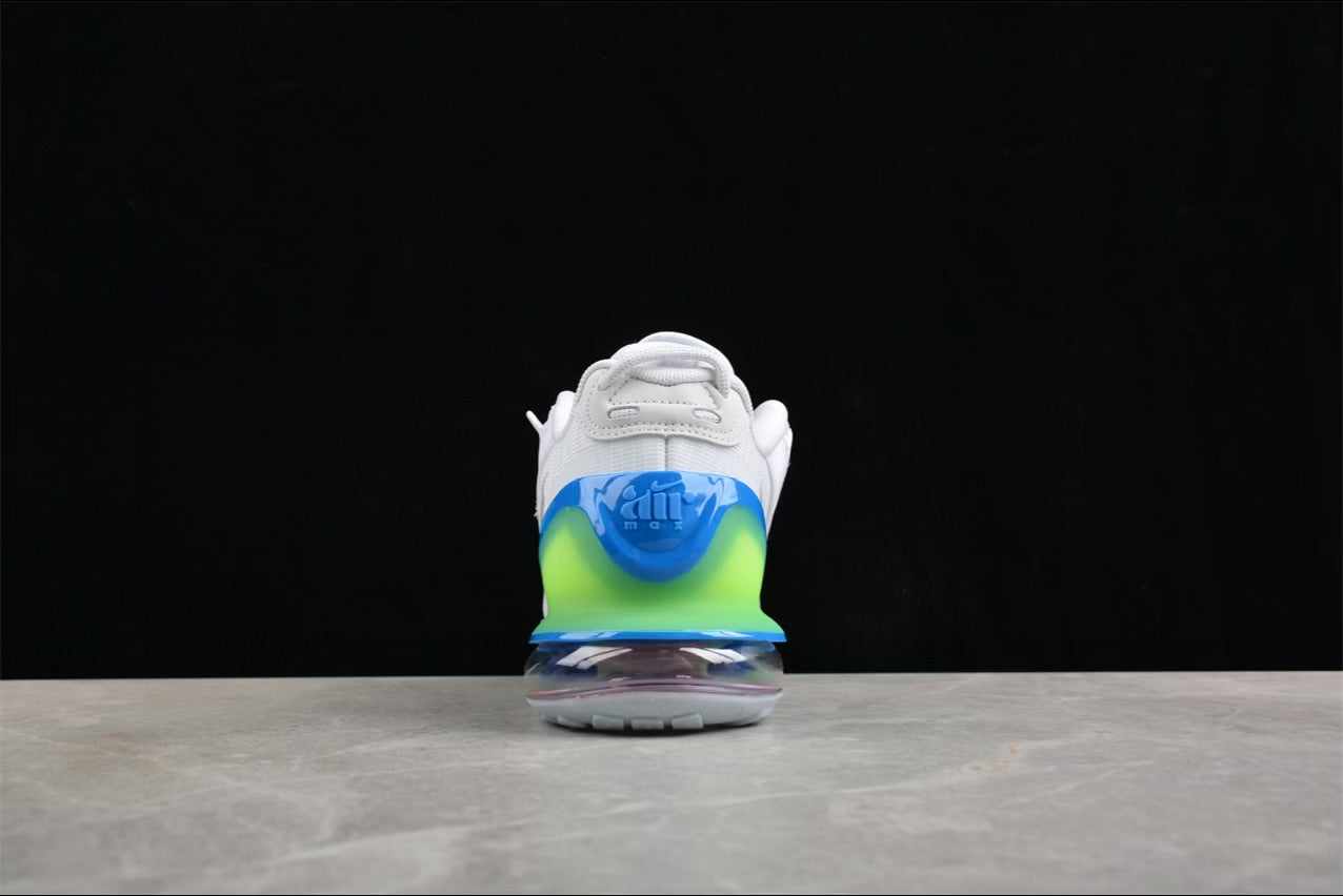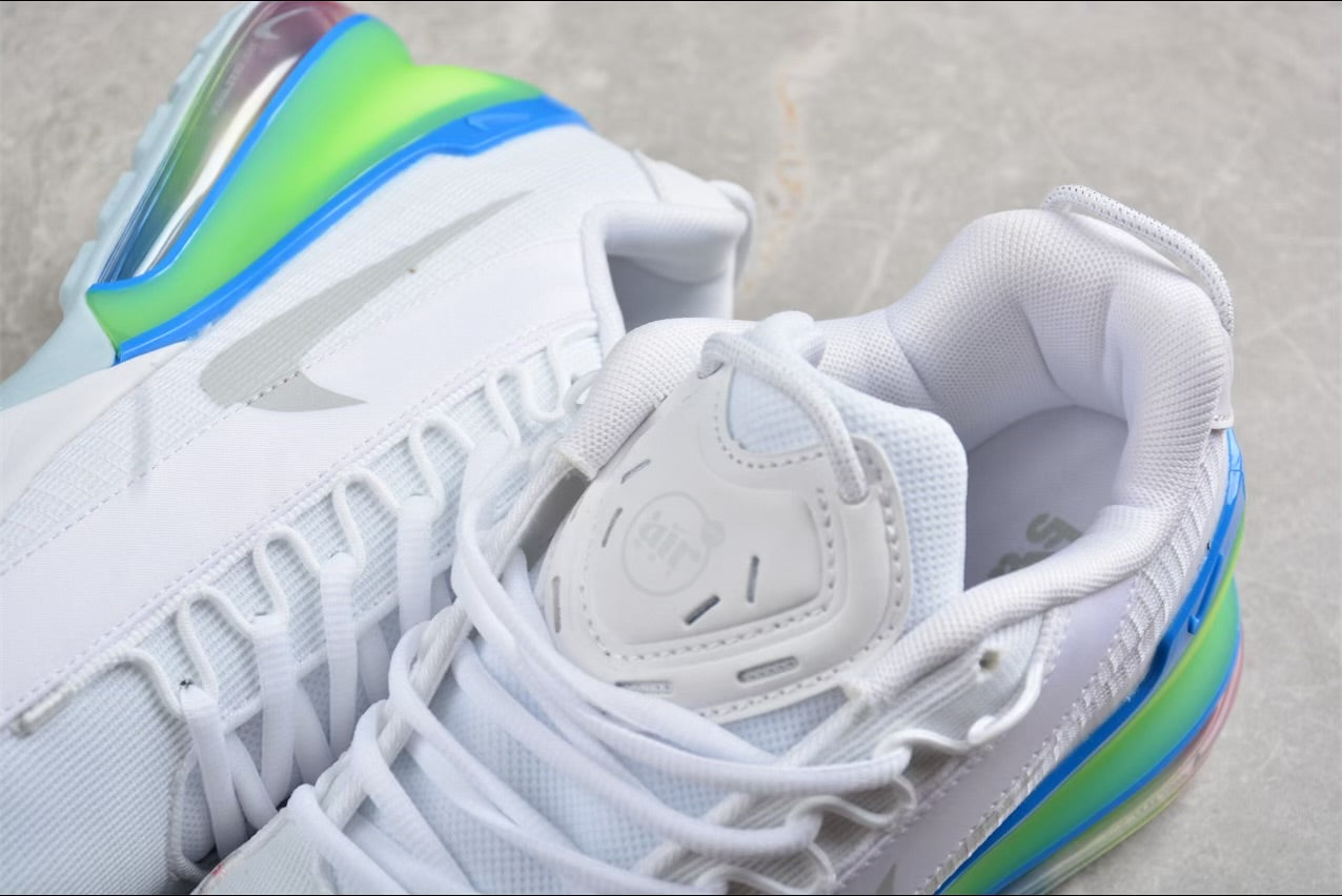 - Ferse: Farbverlauf von Neongrün zu Blau mit einer sichtbaren Air Max 270-Einheit in Pink/Lila-Schimmer