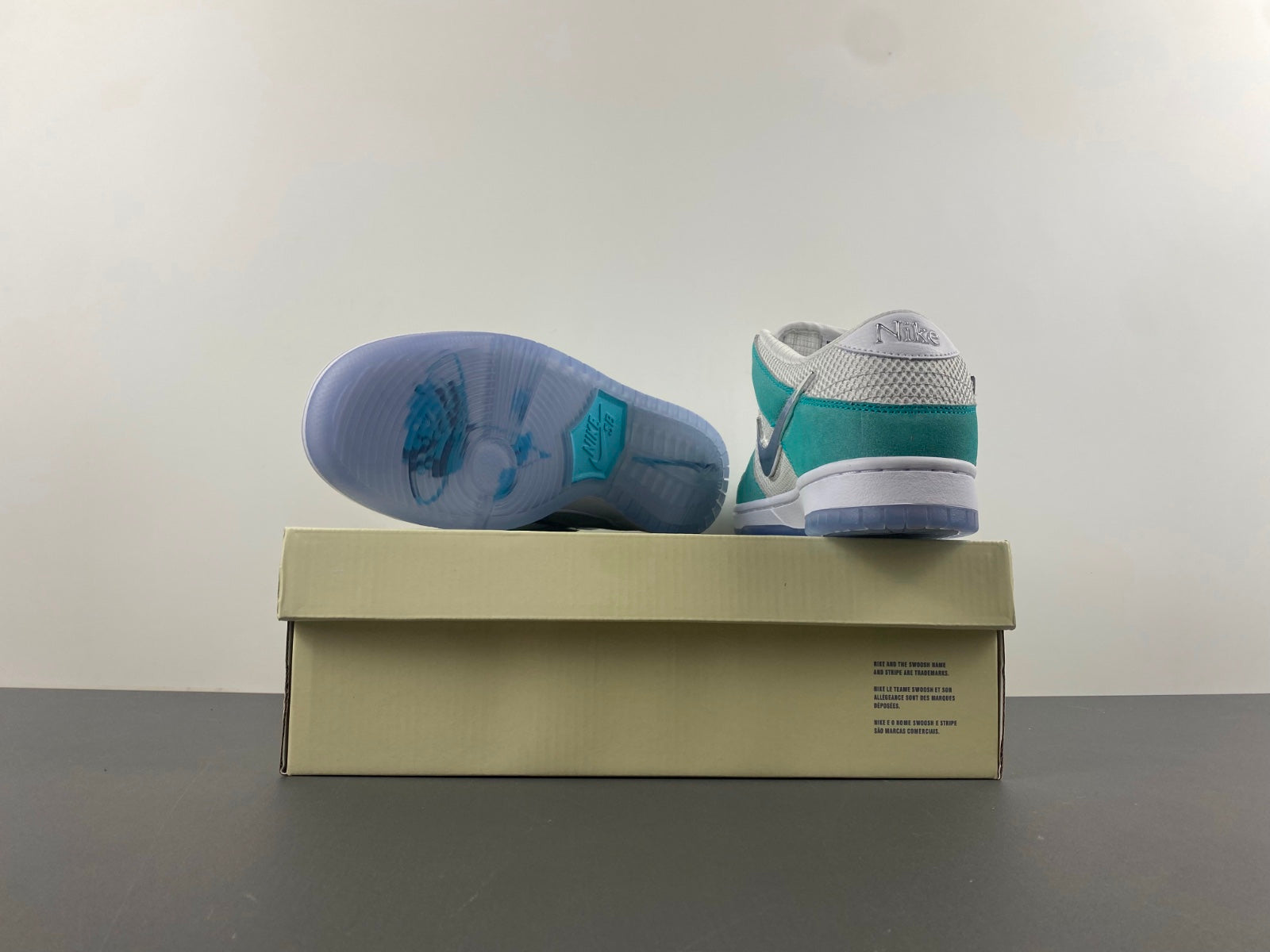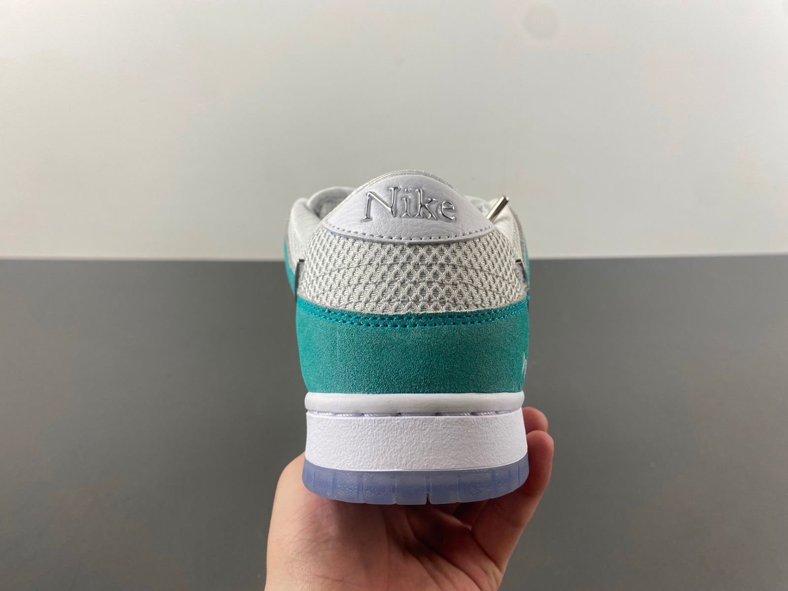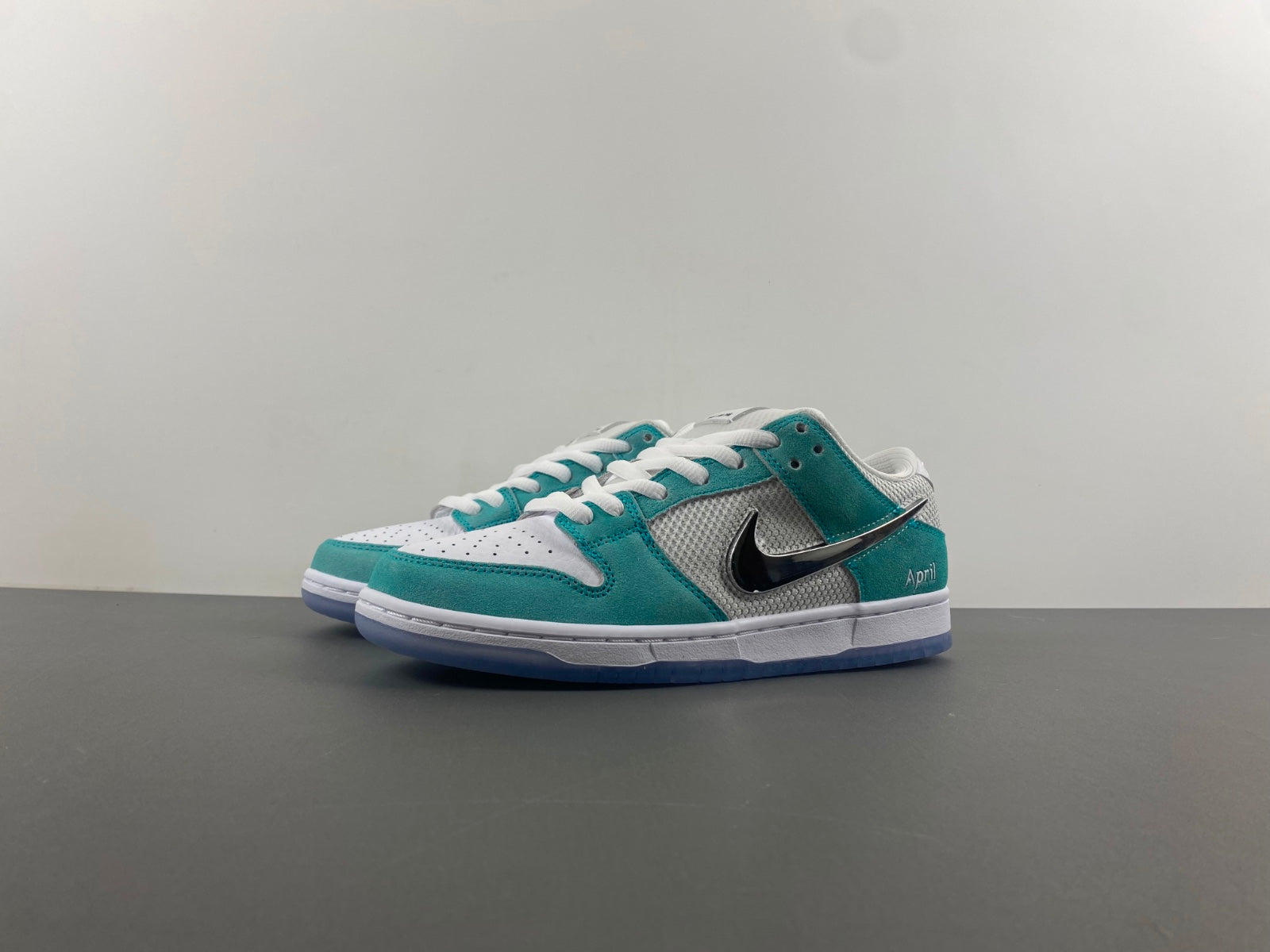 The color scheme of the Nike SB Dunk Low x April Skateboards is immediately eye-catching. It features a Turbo Green base with accents of Metallic Silver and crisp white, balancing skate-friendly toughness with lifestyle luxury.