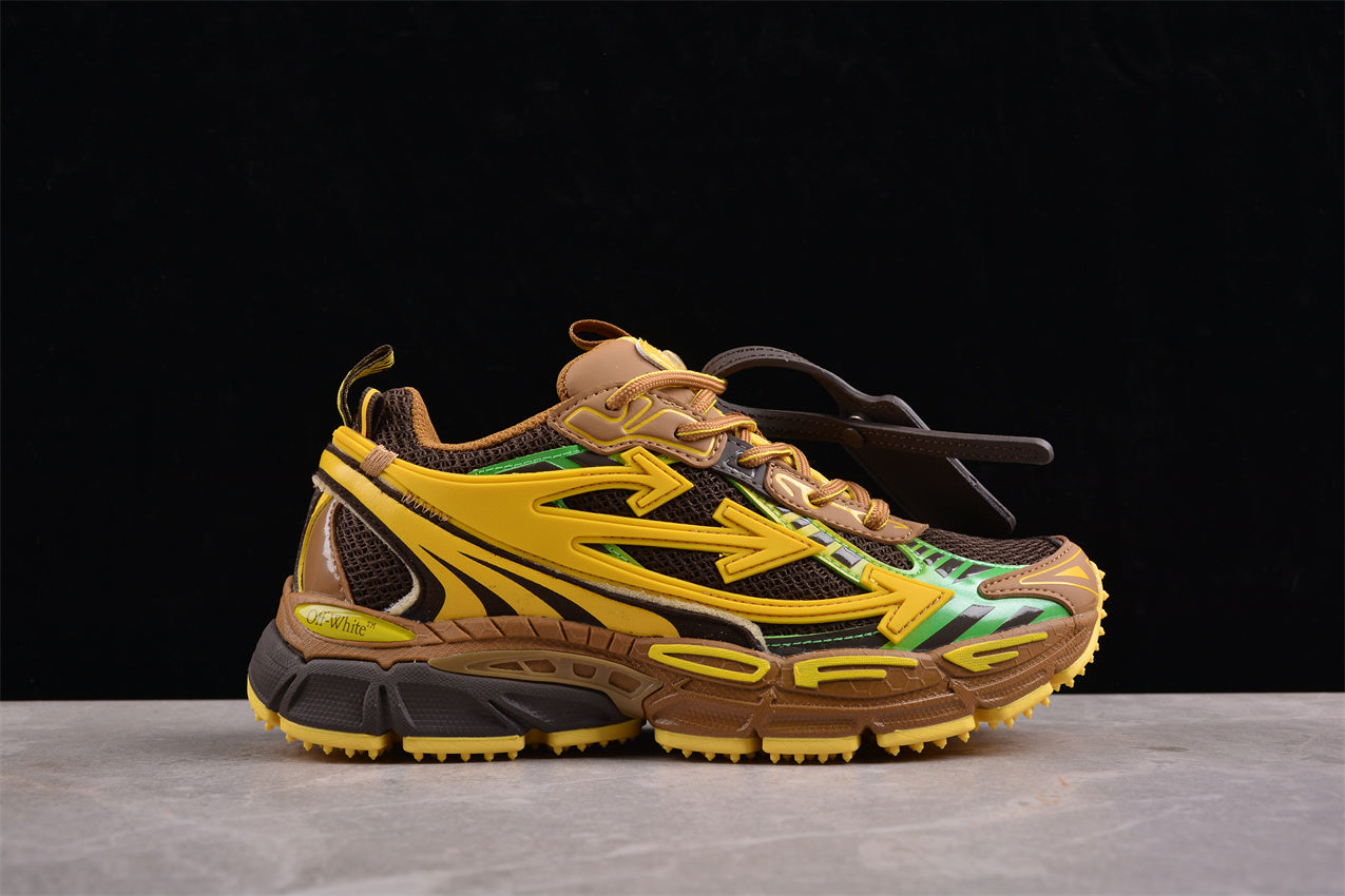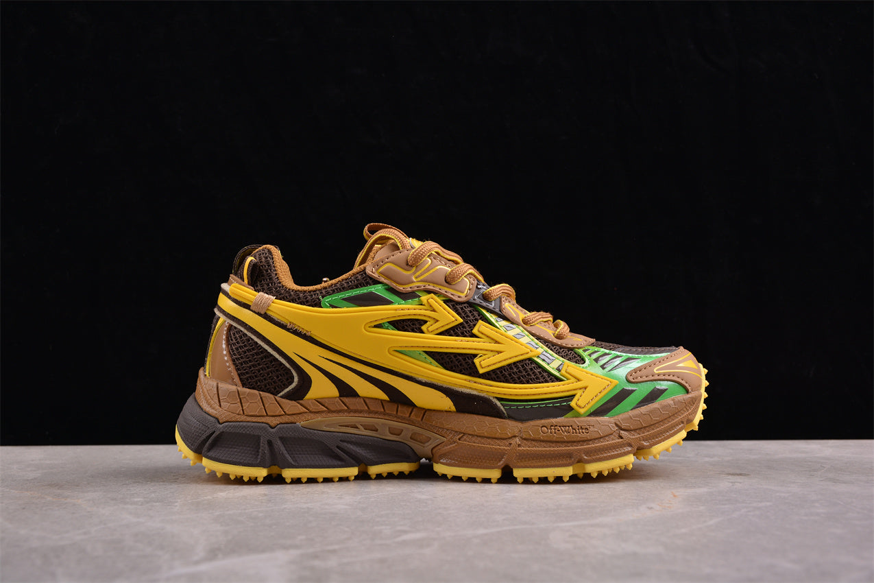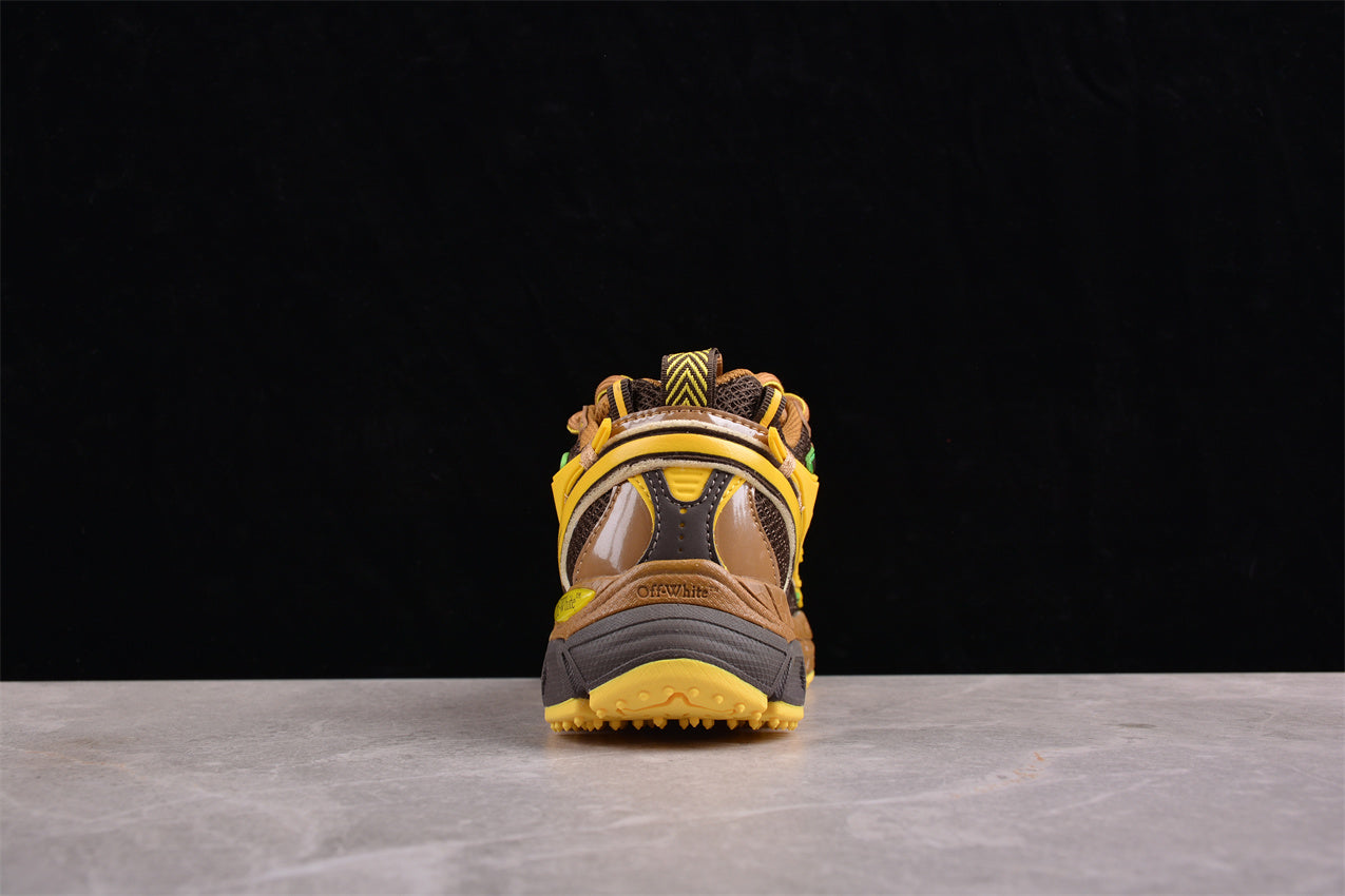 Die grob strukturierte Mittelsohle in Braun mit gelben Highlights wirkt wie ein Geländefahrzeug: ready für alle Oberflächen. Off-White™ Schriftzüge auf der äußeren Flanke erinnern daran, dass Funktion hier mit Kunst kombiniert wurde.