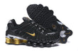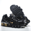 The metallic gold details—from the Swoosh logo to the Shox springs—create a bold statement of luxury. Every element, from the textured outsole grip to the precision lacing system, has been designed for optimal performance and striking visual appeal. The result is a sneaker that looks as powerful as it feels.