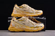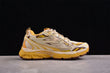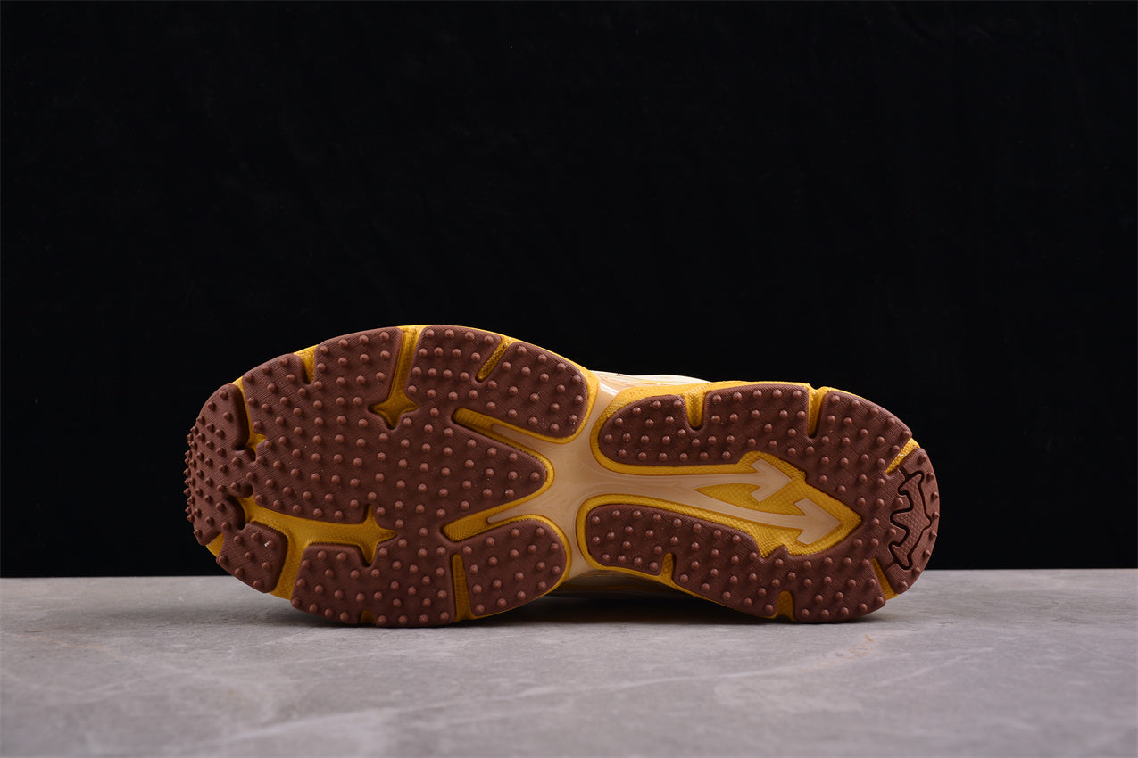 Der erste Blick auf den Sneaker offenbart sofort: Hier wurde nichts dem Zufall überlassen. Die Kombination aus satten Gelbtönen, warmem Braun und cremigem Beige erzeugt ein harmonisches, aber dennoch auffälliges Farbspiel, das sofort ins Auge sticht. Die verschiedenen Farbzonen sind strategisch über das Obermaterial verteilt, sodass Tiefe und Dynamik entstehen.