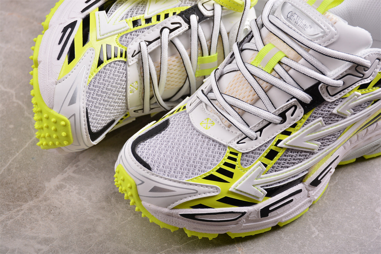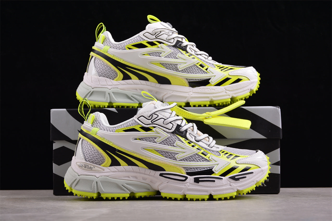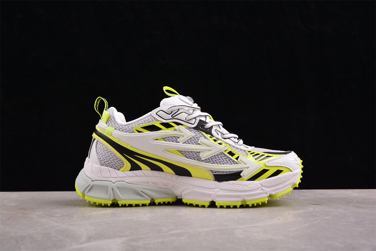Beim ersten Anblick springt die Kombination aus Neon-Gelb, Weiß und Schwarz ins Auge. Die dynamischen Farbkontraste sind kein Zufall – sie rufen die Ästhetik des späten Abloh hervor: laut, verspielt, modern. Besonders das reflektierende Off-White™ Branding auf der Zunge, die sichtbaren Overlays und die auffälligen Pfeile an der Seite erzählen eine Geschichte von Bewegung, Richtung und Geschwindigkeit.