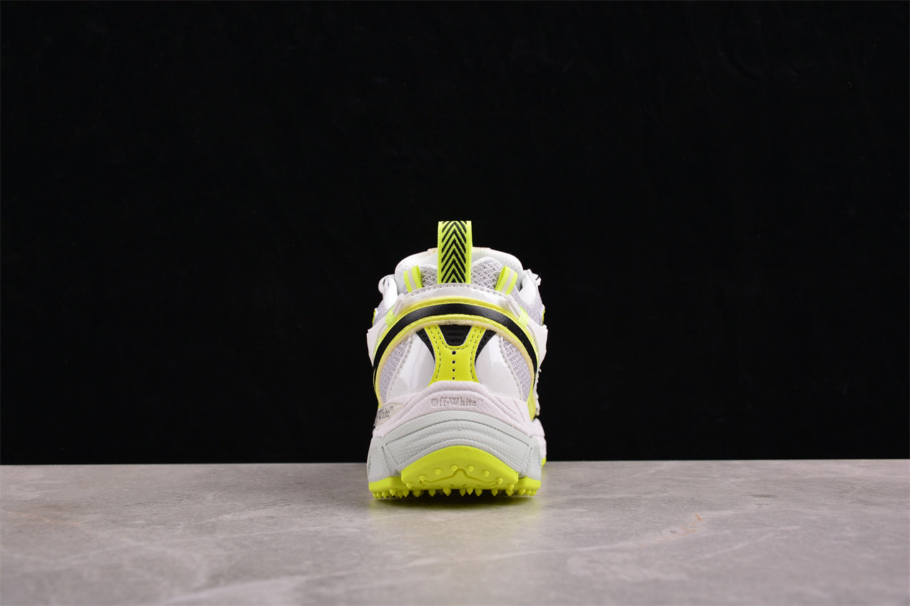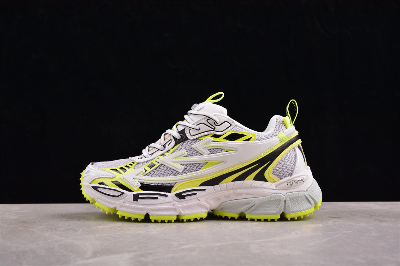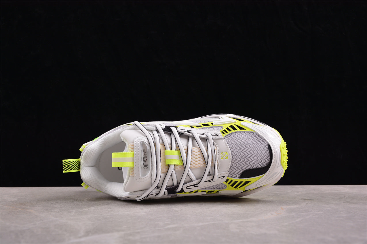 Beim ersten Anblick springt die Kombination aus Neon-Gelb, Weiß und Schwarz ins Auge. Die dynamischen Farbkontraste sind kein Zufall – sie rufen die Ästhetik des späten Abloh hervor: laut, verspielt, modern. Besonders das reflektierende Off-White™ Branding auf der Zunge, die sichtbaren Overlays und die auffälligen Pfeile an der Seite erzählen eine Geschichte von Bewegung, Richtung und Geschwindigkeit.