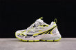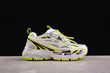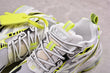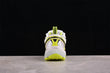 Das Obermaterial besteht aus mehrlagigem Mesh, das sowohl atmungsaktiv als auch visuell transparent ist. Dieses Mesh wird durch synthetische und TPU-Overlays verstärkt, die Struktur und Unterstützung liefern. Die weißen und neongelben Details folgen keinen klassischen Linien, sondern wirken wie von Hand gezeichnet – ein Designelement, das stark an Ablohs Prinzip der „defekten Perfektion“ erinnert.