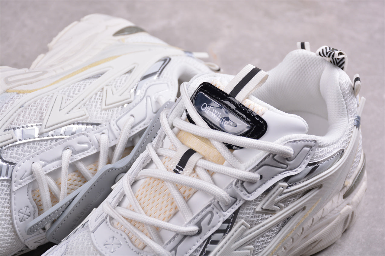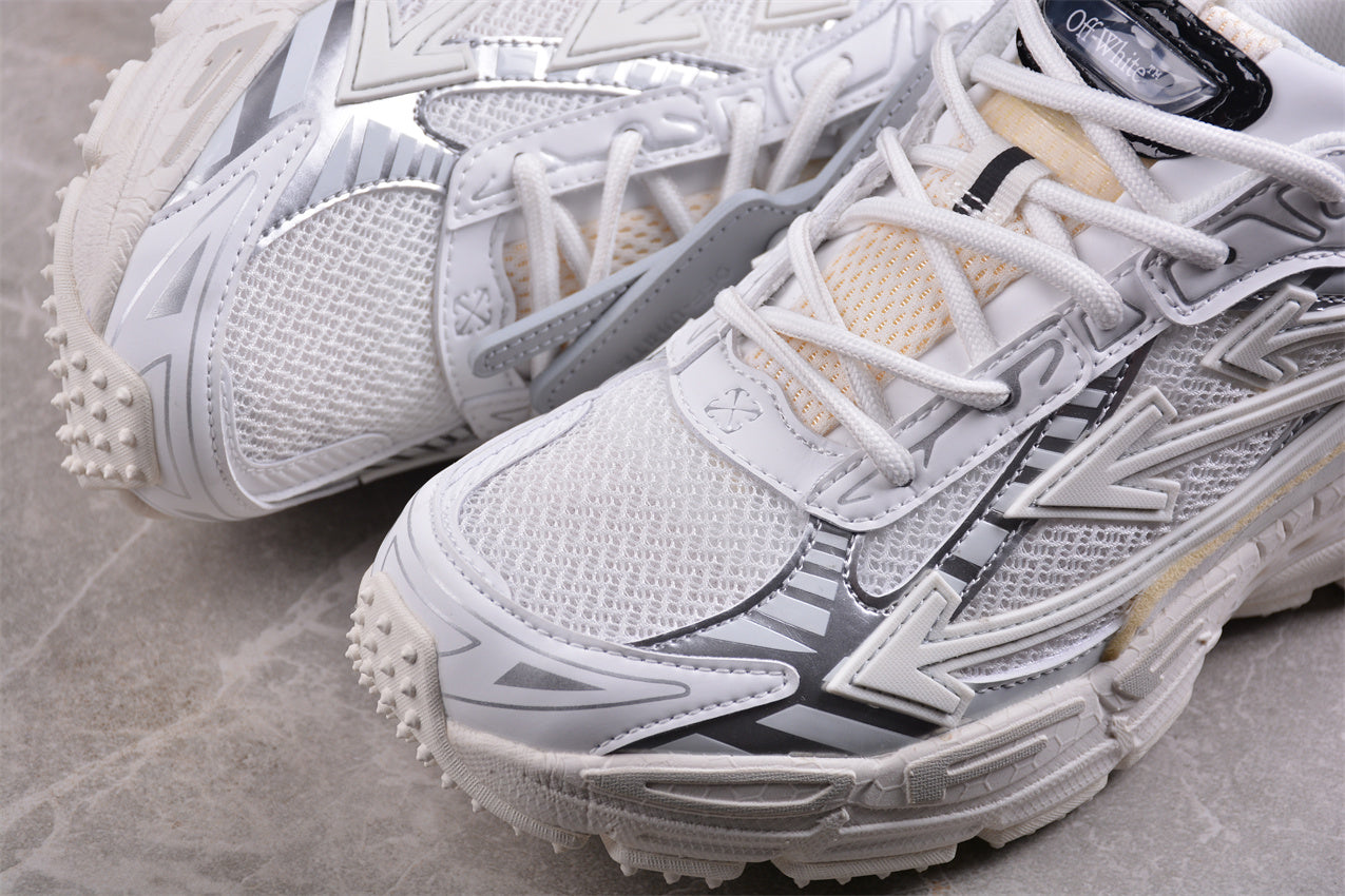 Die mehrlagige Upper-Konstruktion vereint Mesh, synthetisches Leder und TPU – Materialien, die sich in ihrer Textur und Transparenz kontrastieren und dennoch miteinander verschmelzen. Die Layer erinnern an architektonische Fassaden oder das Äußere eines High-Tech-Fahrzeugs. Besonders auffällig sind die dreifach gestapelten Pfeil-Overlays, die sofort die Handschrift von Off-White™ erkennen lassen.
