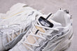 Der erste Eindruck dieser Sneaker ist überwältigend: Eine harmonische Komposition aus verschiedenen Weiß- und Silbertönen, unterbrochen von strukturellen Details, reflektierenden Overlays und technischen Linienführungen. Diese Farbgebung verleiht dem Schuh eine clean futuristische Aura, die sowohl auf der Straße als auch in High-Fashion-Kreisen funktioniert.
